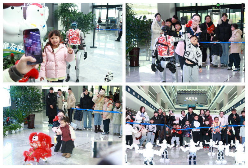 寒假压轴,我馆还精心策划了全馆精品讲解、高压放电演示及趣味科普秀表演,还升级了AI机器人表演。舞狮机器狗摇头摆尾,复刻传统神韵;人形机器人起手推掌,太极打的行云流水;精巧灵动的小机器人则跟着节奏整齐舞动,格外吸睛。现场气氛热烈,游客们纷纷驻足观看、互动打卡,沉浸式感受科技带来的乐趣。