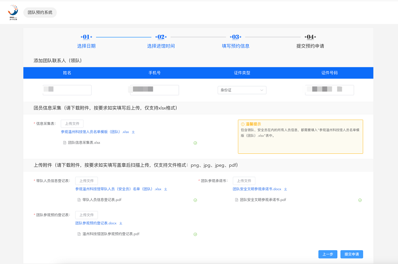 7.所有信息填写完成后,提交预约申请,等待后台审核,审核结果发送短信通知给团队联系人(领队)。