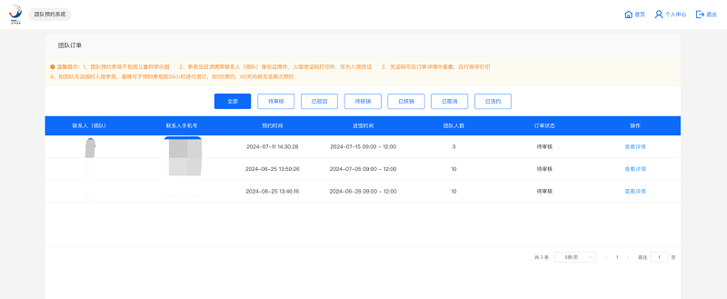 8.团队预约申请提交后,可在相关页面查看团队订单信息,以及团队订单审核情况。