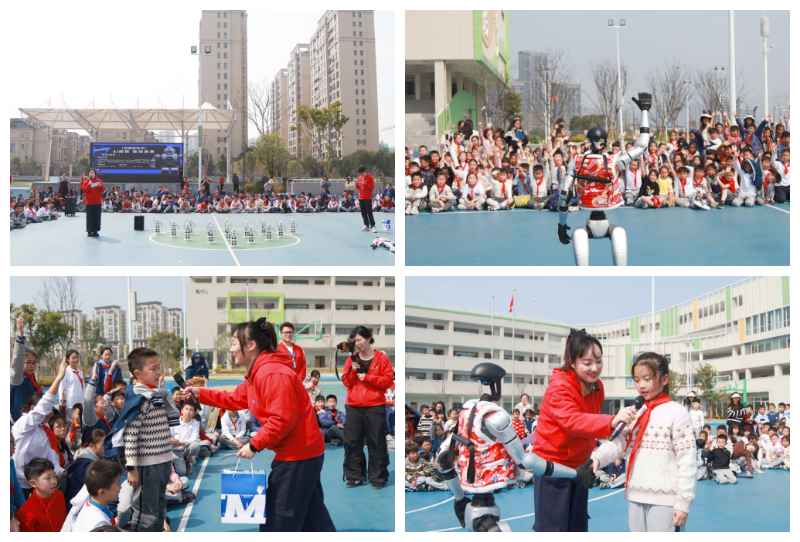 活动开场,人形机器人与机器人特工队联袂登场。机器人特工队带来了一首首脍炙人口的歌曲舞蹈串烧,精准流畅的动作配合动感音乐,展现了AI算法与运动控制技术。而人形机器人则与同学们进行面对面的互动,它不仅能够识别指令,还能与孩子们进行握手互动。此外,现场还开展了知识问答挑战,同学们在欢笑中感受到了科技的魅力与温暖。通过与机器人的亲密接触,同学们对人工智能、编程等科学知识有了更直观、更深入的理解,心中种下了探索未知、追求创新的种子。