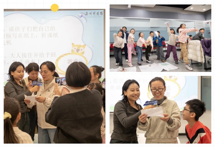 随着纸飞机从场地一侧飞向另一侧,家长们随机接住这些承载着心事的小小信使。当一位位家长认真读出手中纸飞机上的烦恼,并真诚回应"我能理解你的感受"、"让我们一起想办法"时,现场弥漫着温暖而治愈的氛围。这个精心设计的环节,让倾听不再是单方面的接受,而成为亲子间双向的情感流动。