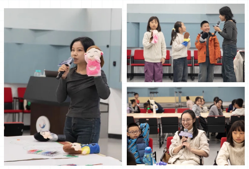 活动伊始,蔡蔡老师通过三个手偶——活泼好动的小凯、敏感多思的璇璇、沉默寡言的心仪,展现了孩子们在日常生活中遇到的真实困扰。孩子们在课业压力、同伴关系、家庭沟通中的烦恼通过手偶剧场自然流露,引发了现场小观众的共鸣。并在蔡蔡老师的鼓励下,孩子们勇敢地在纸上写下自己的烦恼,随后,家长们接过这沉甸甸的“心声”,小心翼翼地将其折叠成一只纸飞机。