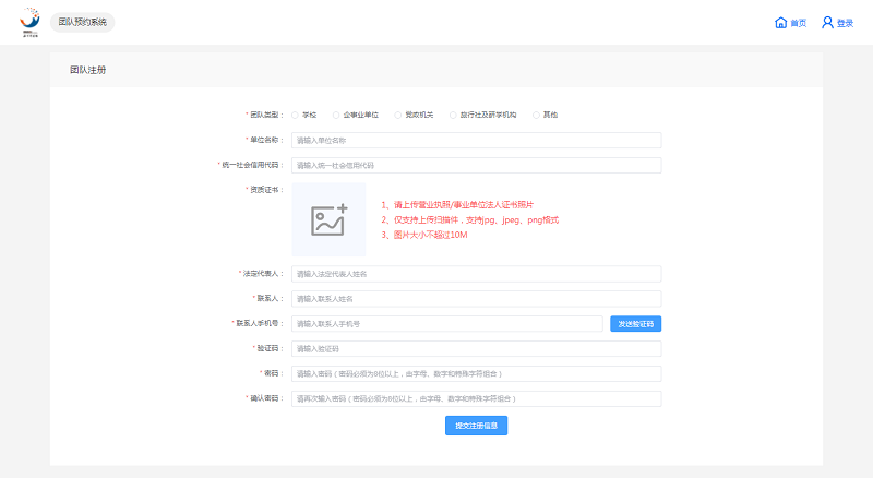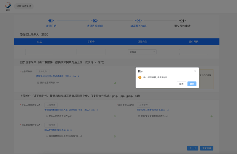 7.所有信息填写完成后,提交预约申请,等待后台审核,审核结果发送短信通知给团队联系人(领队)。