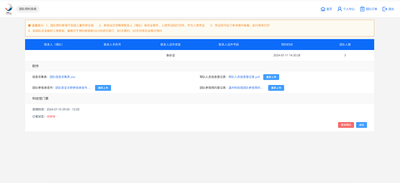 6.团队预约申请提交后,其订单处于审核状态时可重新上传相关附件。