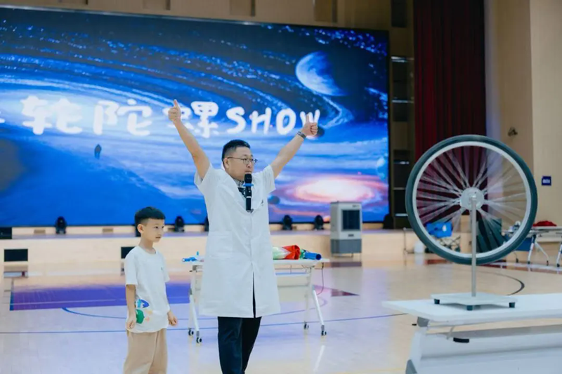 第一个实验“车轮陀螺”,田老师拿起看似笨重的车轮,轻轻顶在手指上一转——神奇的事情发生了!车轮像被施了魔法的陀螺,稳稳地在指尖旋转,完全不会掉下来。同学们纷纷瞪大双眼,嘴里不停喊着“哇!怎么做到的?”还有不少同学举着手,跃跃欲试想要亲自挑战。