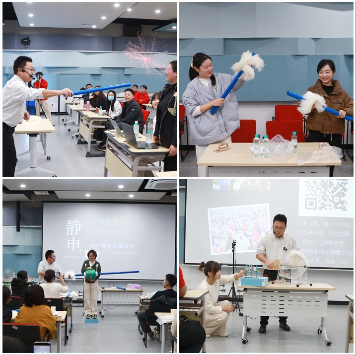 为落实教育部、中国科协等七部门《关于加强中小学科技教育的意见》文件要求,着力在教育“双减”中做好科学教育加法,以及进一步推进温州科普场馆体系建设,助力联盟场馆运营水平提升,12月3日,科学实验创新能力提升专项培训班在温州科技馆“放电”开课。此次活动特邀温州科技馆科学顾问田若平老师担任主讲,围绕“静电场”主题推出九大多元实验。来自馆校结合校的科学教师、科普场馆联盟成员单位的科普辅导员以及我馆科普辅导员等50人参与此次培训。