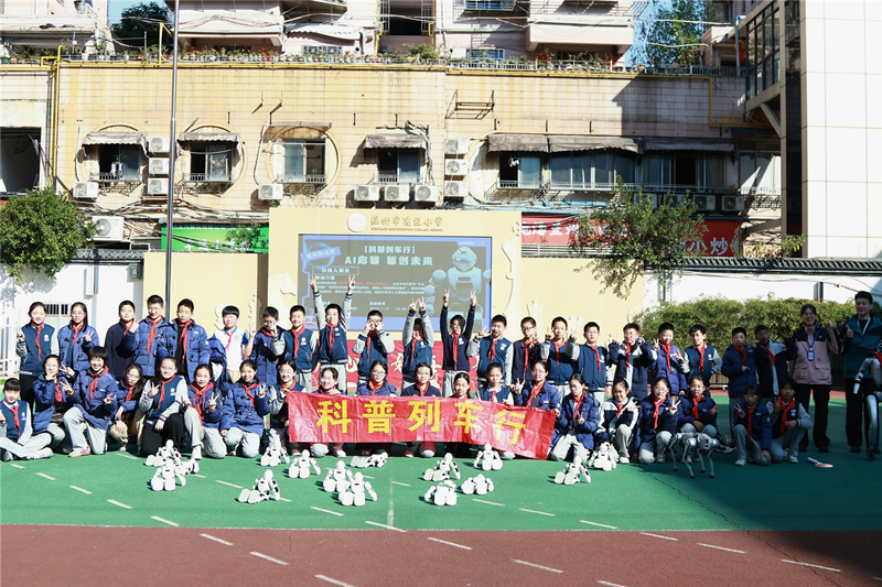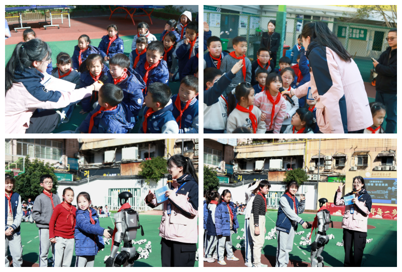 随后,人形机器人缓慢入场,与同学们进行了拥抱、握手、击掌等近距离互动。四足机器狗则展示了截然不同的灵活与敏捷。它不仅能稳健行走、小跑,还会作揖、比心。每一个流畅的动作变换,都引来阵阵“好厉害”的喝彩。科技问答环节,同学们积极举手,准确地回答出来一个个科学小问题,并获得了精致的小礼物。